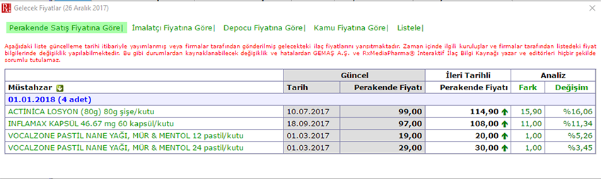 İlaç Fiyat Kararnamesi’ne göre, İlaç Fiyat Listelerinde yer alan müstahzarların izleyen tarihlerde alacağı yeni fiyatları raporlamanızı sağlar. Bu rapor yardımıyla Perakende Satış Fiyatı, Üretici Fiyatı, Depoco Fiyatı ve Kamu Fiyatına göre rapor hazırlayabilirsiniz. Raporlar, tarihe göre gruplandırılır ve müstahzarların mevcut fiyatına göre artma veya azalma durumlarını görüntüler. Değişim tutarı ve oranlarını da raporlar.