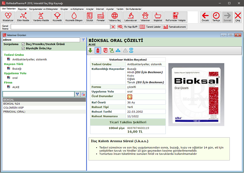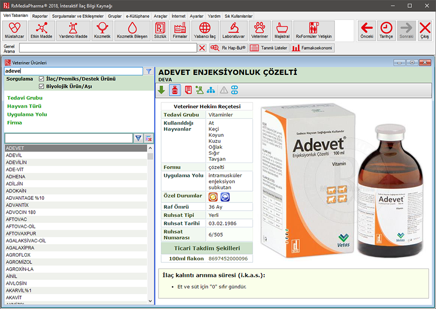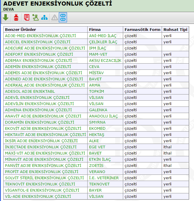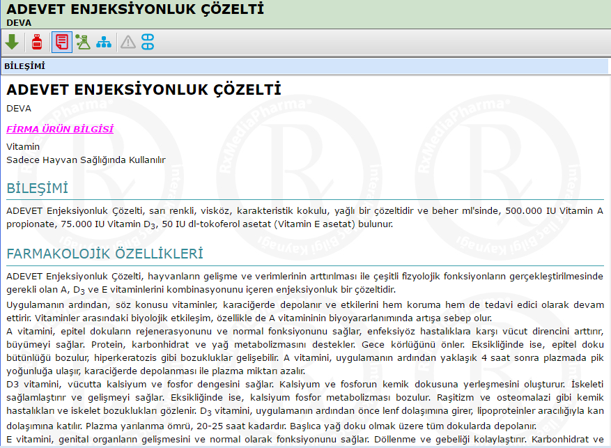 Veteriner Ürünler Veritabanı Türkiye’de pazarlanan veteriner tıbbi ürünleri içermektedir. Bu veritabanındaki ilaç ve tıbbi ürünler için verilen bilgiler, T.C. Gıda Tarım ve Hayvancılık Bakanlığı tarafından onaylanmış prospektüs bilgilerini içermektedir. Özgün prospektüse ulaşılamayan durumlarda ilgili ürünlere ait derlenmiş özet bilgileri verilmiştir.